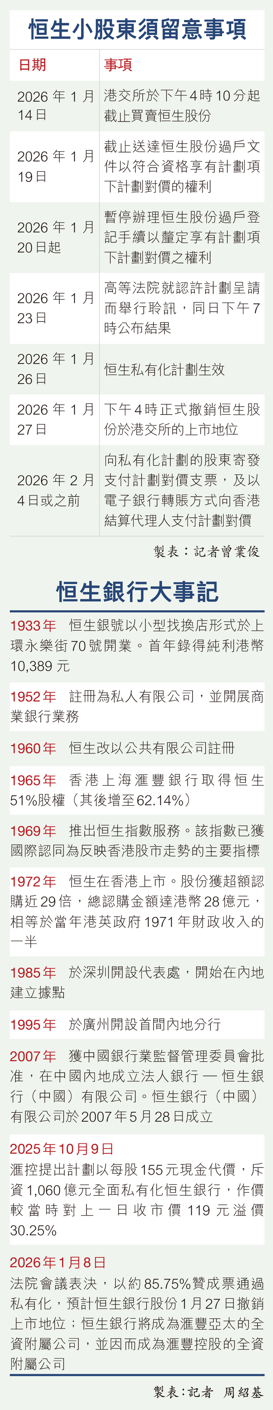 恒生股份的最後買賣日期則為本月14日下午4時10分,2月4日或之前向小股東寄發支票或電子轉賬支付對價。恒生股價昨收報153.9元,升0.065%;滙控收報124.3元,跌2.28%。恒生及滙控股價,分別較2025年10月9日提出私有化方案前,即10月8日的收市價119元及110.6元,分別升29.33%及12.39%。