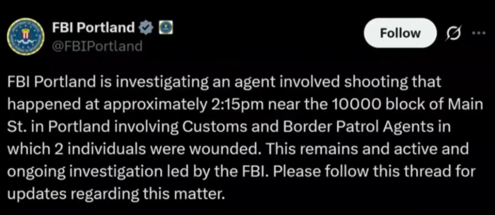 聯邦調查局證實,事件涉及CBP特工在執法期間開槍。儘管初步細節仍有待確認,但因應明尼阿波利斯市日前剛發生移民局(ICE)射殺37歲單身母親的惡性事件,觸發當地示威及社會高度對立。波特蘭警察局局長Bob Day發表聲明,呼籲社區保持冷靜。