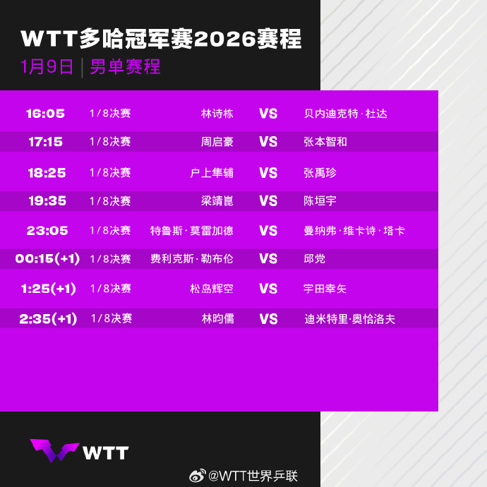 1月9日,WTT多哈冠軍賽2026將展開第三天的較量,1/8決賽全面打響。國乒林詩棟、梁靖崑、王藝迪、蒯曼等將出戰。具體賽程如下: