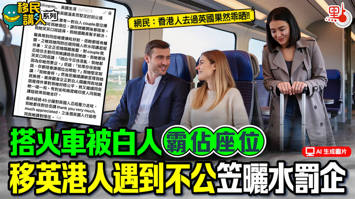 【點新聞報道】不少移英港人過着「二等公民」的生活,當中不少人要睇人面色,來換取其卑微的存在。有移英港女在網上分享一次在英國坐火車被霸佔座位後,只能站在一旁施壓,希望對方還回座位,經過45分鐘罰企後,終於得償所願,更沾沾自喜地宣聲稱是「溫柔而堅定討回公道」。有網民留言揶揄「香港人去過英國果然乖晒」。