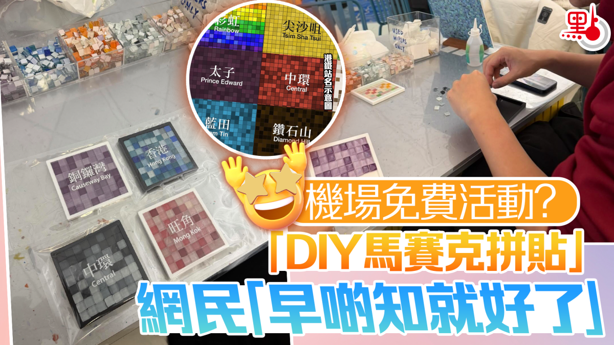 港女於社交平台上傳相片,並寫道「香港機場Gate32有得免費玩,好可愛」。從她上傳的相片中可見,活動應該是「DIY馬賽克拼貼」,只見做手工的桌子上擺放着幾盒不同顏色的迷你方塊和一樽膠水,而樓主身旁的人正在進行粘貼的動作。最後成品是一塊大的馬賽克方塊,上面還可以貼上本港不同地點名稱的貼紙,手工作品有些類似於港鐵站內馬賽克瓷磚上標示「站名」的特色裝飾。