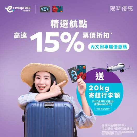 今次香港快運聯同滙豐信用卡推出機票優惠,首4000名預訂精選航點機票的旅客,輸入優惠碼【HSBCUO26】,即享85折優惠,同時將會獲贈價值$380行李代金券一張,相當於為旅程免費加購一件20KG寄艙行李。