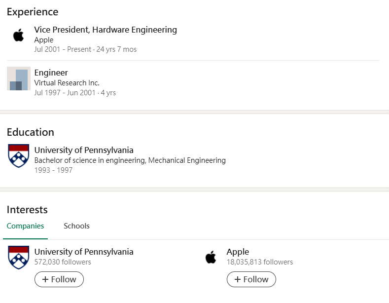 特努斯是美國加州人,擁有賓夕法尼亞大學機械工程學士學位,入職蘋果之前,他曾在Virtual Research Systems擔任機械工程師。