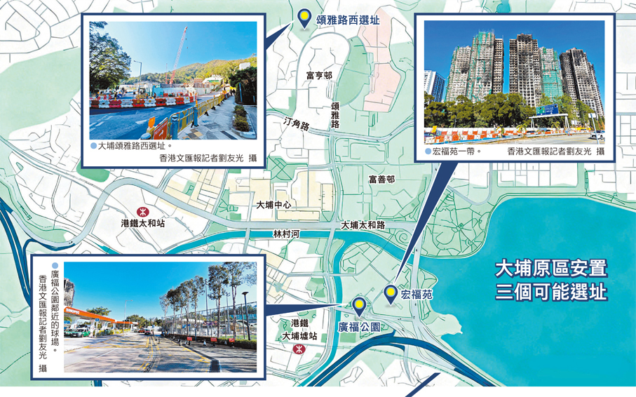 問卷同時列出3個大埔原區有可能興建的新居屋單位地點,包括頌雅路西選址、廣福公園選址及宏福苑原址。參考資料提醒業主,大埔現時沒有新居屋或「綠置居」項目,因此若希望政府提供全新居屋或「綠置居」項目單位,跨區安置較原區安置可更快上樓。若希望原區安置,大埔頌雅路西選址可最快上樓,因已完成土地平整工程,可率先提供約900個單位,預計需時約3年至4年入伙,較一般項目快約兩年落成。