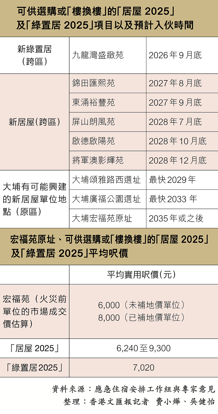 問卷列出「居屋2025」5個跨區新居屋發展項目、一個「綠置居2025」、一個新發展項目的預計入伙日期及呎價(見表),其中以九龍灣盛緻苑的「綠置居2025」項目預計可於今年9月底入伙最早,居屋項目則預計介乎明年第三季至2028年年底入伙。