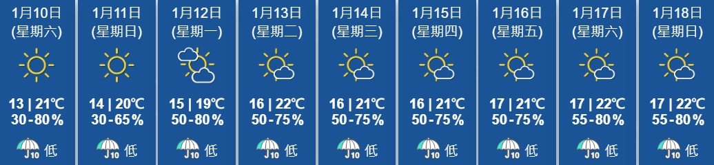 天文台預測,東北季候風會在今明兩日繼續為華南沿岸帶來普遍晴朗及非常乾燥的天氣,內陸地區寒冷。而一股達強風程度的偏東氣流會在下周初影響廣東沿岸。預料乾燥的東北季候風會在下周中至後期為沿岸地區帶來大致晴朗的天氣。