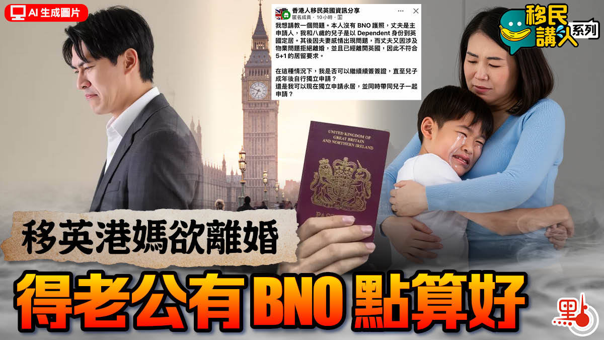 該名移英港媽在fb群組「香港人移民英國資訊分享」發文向網民求教,「本人沒有BNO護照,丈夫是主申請人,我和八歲的兒子是以Dependent身份到英國定居。其後因夫妻感情出現問題,而丈夫又因涉及物業問題拒絕離婚,並且已經離開英國,因此不符合5+1的居留要求。」