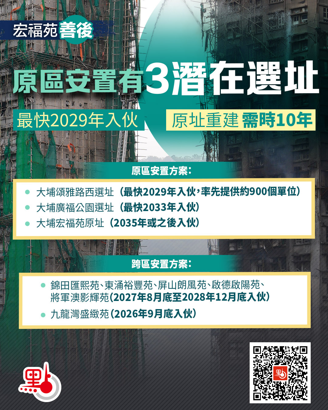 【點新聞報道】特區政府由昨日(9日)起,陸續透過社署的「一戶一社工」機制,主動接觸受火災影響的宏福苑業主,收集他們就長遠安置方面的初步意願,目標在本月中下旬取得回應並進行分析,以協助制定和落實具體方案。問卷中提出原址重建、在廣福公園選址或大埔頌雅路西選址重建3個方案,後者預計最快2029年入伙需時最短,原址重建則預計要等到2035年或之後才入伙,需時最長。