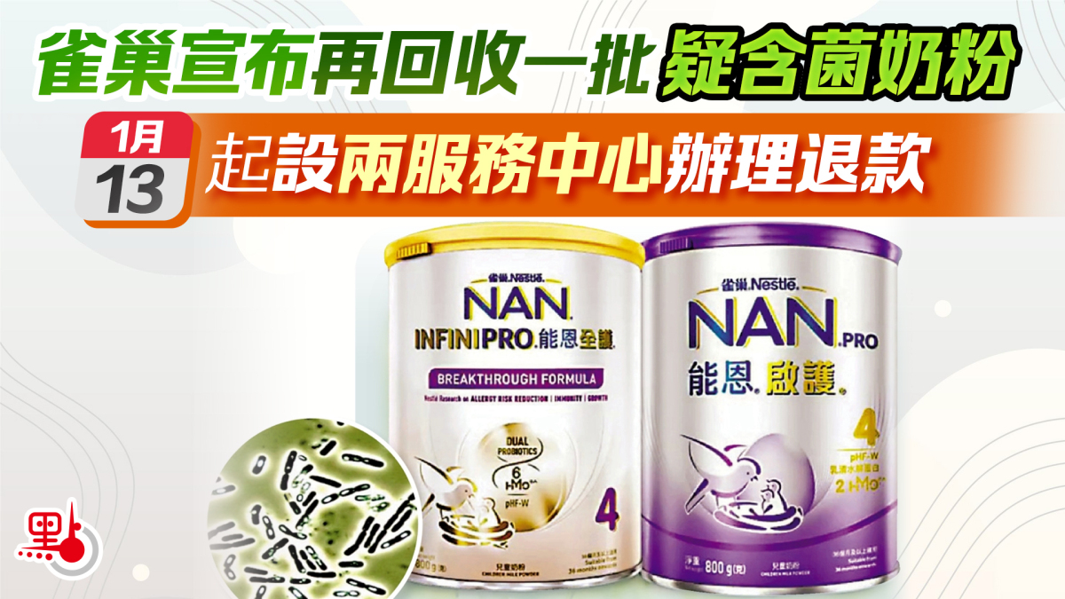 【點新聞報道】食物安全中心早前指出,雀巢能恩及惠氏營養品21個批次的嬰幼兒配方奶粉的原材料可能存在源自微生物蠟樣芽孢桿菌的物質,呼籲市民不要食用。雀巢香港今晚(10日)再公布,即日起「預防性自願回收名單」再增加一個批號,若家長對孩子的健康感到憂慮,承諾會提供支援。