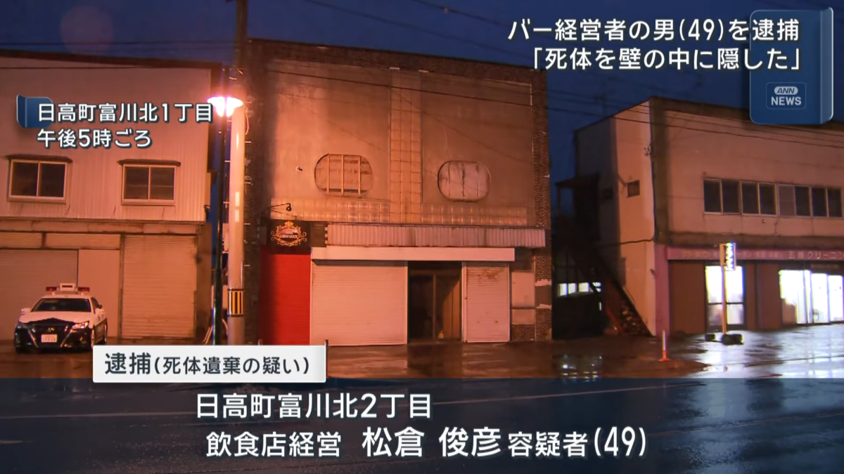【點新聞報道】據日本HBC新聞、日本電視台等多家日媒報道,日本警方10日凌晨在北海道一家餐廳的牆壁內發現了一具成年女性的遺體,隨即以遺棄屍體罪逮捕了49歲的店主松倉俊彦。警方分析稱,遺體可能是一名失蹤多日的20多歲女性,正朝謀殺方向展開調查。