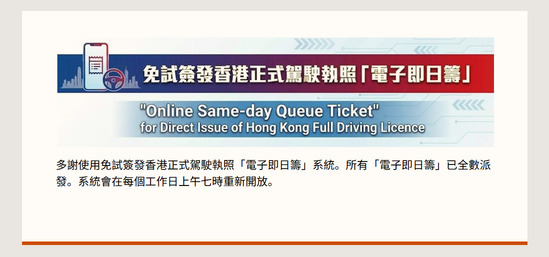李美鳳在電台節目中表示,為進一步優化免試簽發的申請程序,確保有需要人士公平有序使用服務,「電子即日籌」安排全面取代現場派籌。電子籌程序開始後設置排隊功能,讓公眾有序進入系統,申請人進入頁面後只需要輸入簡單個人資料,包括英文姓名、身份證明文件包括護照或往來港澳通行證的頭4個數字或字母,以及可收到短訊的手機號碼和電郵。
