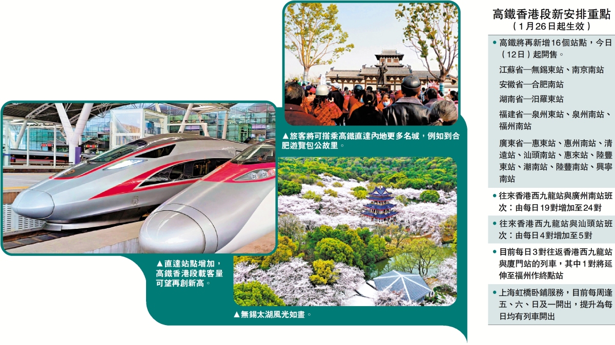 有旅行社就新增直達站點,率先推出首發高鐵團,在新增站點開通首日出發往南京,行程包括賞梅、夜遊秦淮燈會等。旅遊業人士表示,高鐵香港段新增直達站點,可吸引更多內地朋友赴港旅遊,同時也為港人北上暢遊提供更多選擇。