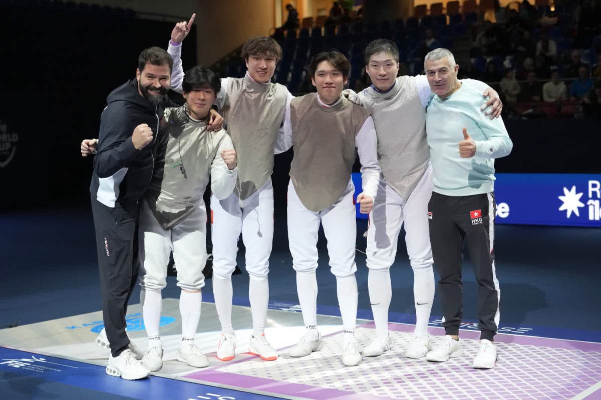 「世一」蔡俊彥一日前才奪得個人賽銀牌,休息一天後夥拍張家朗及林浩朗出戰團體賽,合力在三十二強以45∶26大勝卡塔爾、十六強45∶30勝波蘭隊,以及八強以45∶34戰勝爆冷力克「世一」意大利的中立運動員隊;港隊愈戰愈勇,四強由頭帶到尾下以45∶32擊退日本隊殺入決賽。