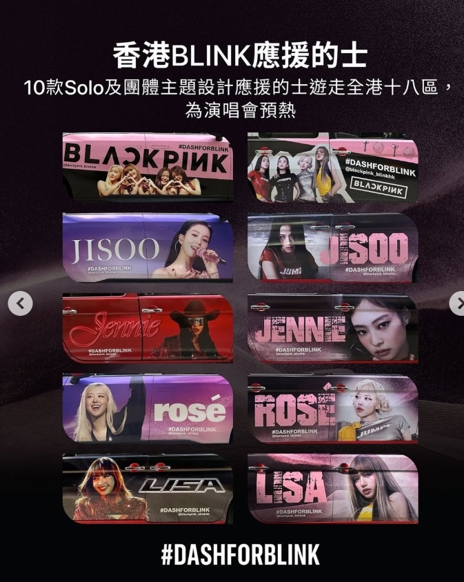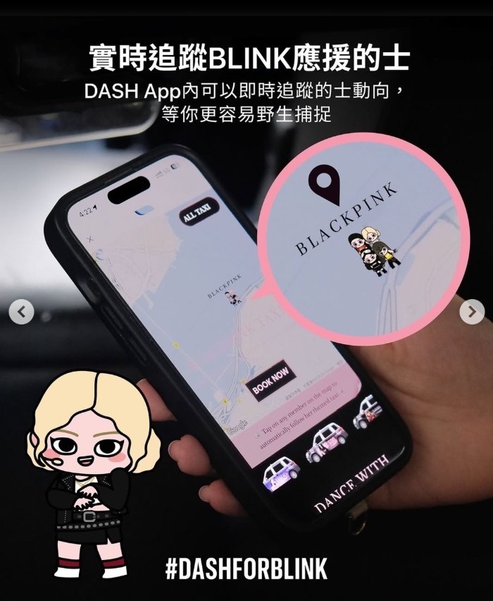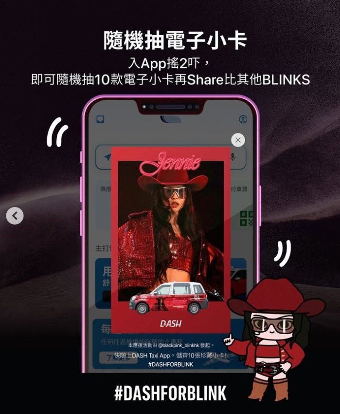 活動將日常出行體驗升級,從預約主題的士、搖動手機獲取獨家數碼收藏卡,到參與應用程式內可累積分數助偶像上榜的舞蹈節奏遊戲,為粉絲帶來沉浸式互動體驗。DASH歡迎BLINKs透過的士與文化的無縫融合體驗香港城市魅力,一同追蹤和乘搭主題的士,迎接國際女團到港。當中包括,主題的士實時追蹤,DASHTaxi應用程式提供實時地圖,讓粉絲隨時鎖定遊走在香港街頭的BLINK應援的士;搖一搖抽取電子小卡,即打開應用程式並搖動手機兩次,即可隨機抽取由@blackpink_blinkhk團隊獨家設計的限量數碼小卡;應用程式內的舞蹈節奏小遊戲,挑選BLACKPINK經典金曲,配合招牌舞步完成挑戰,累積分數助你最愛的成員登上排行榜首位。