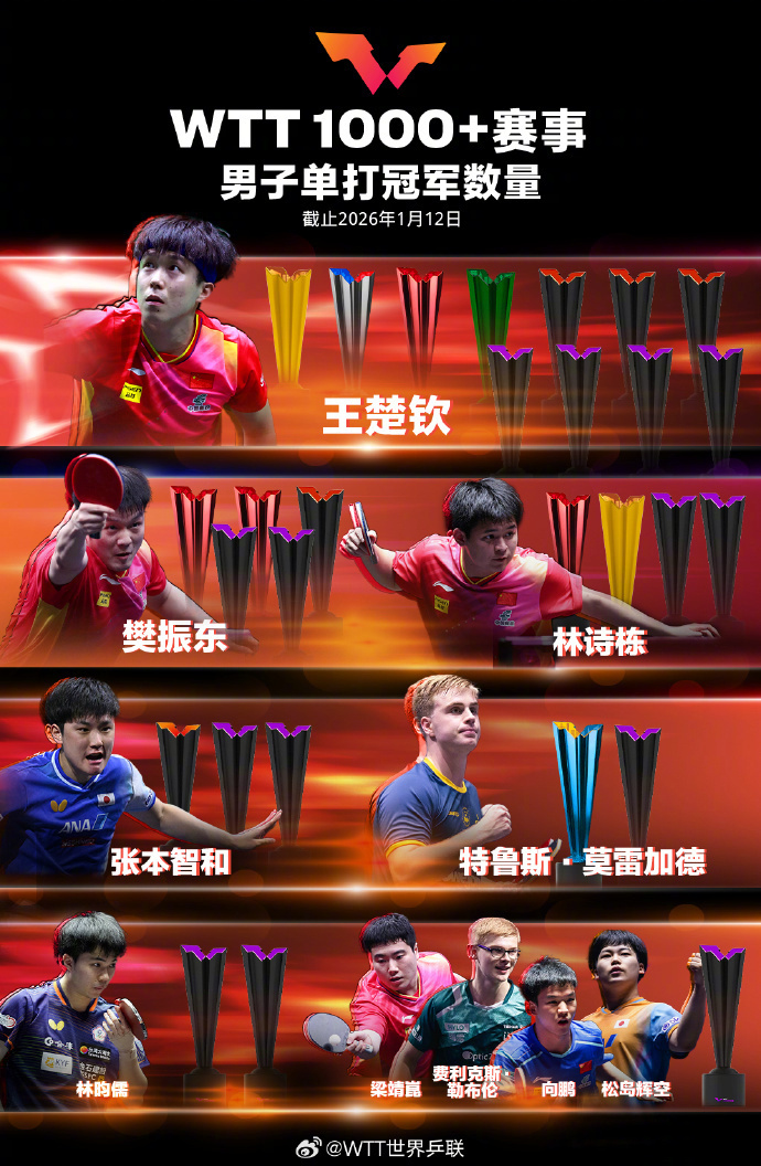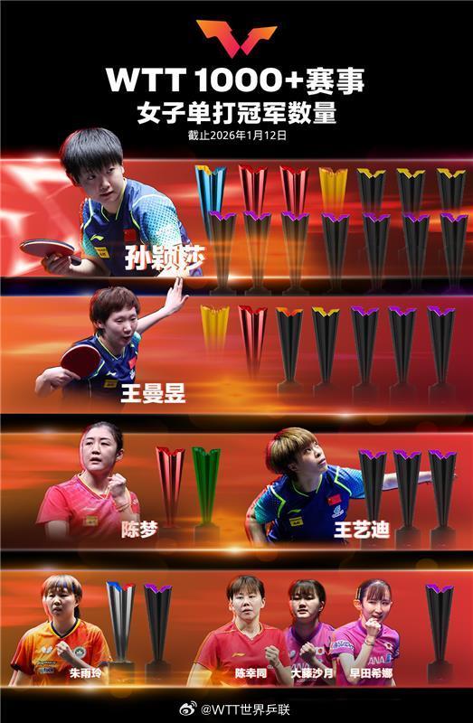 【點新聞報道】今日(12日)國際乒聯(WTT)公布2026年第3周世界排名及WTT1000+冠軍榜。王楚欽孫穎莎繼續領跑冠軍榜,男子單打冠軍數量,王楚欽、樊振東、林詩棟位列前三;女子單打冠軍數量,孫穎莎、王曼昱、陳夢位列前三。