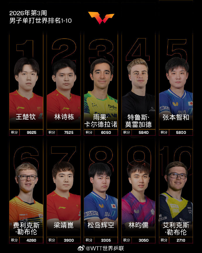 男子單打,中國隊球員王楚欽、林詩棟位列前二,梁靖崑位列第七。WTT多哈冠軍賽男單冠軍林昀儒排名上升4個名次位列第9;亞軍張禹珍排名上升4個名次位列第14;八強特魯斯·莫雷加德排名上升1個名次位列第4;瑪納什·沙排名上升17個名次位列第58,刷新個人職業生涯排名新高。其他中國隊球員,向鵬排名第12,陳垣宇排名第23,周啟豪排名第36,陳俊菘排名第43,林高遠排名第50。