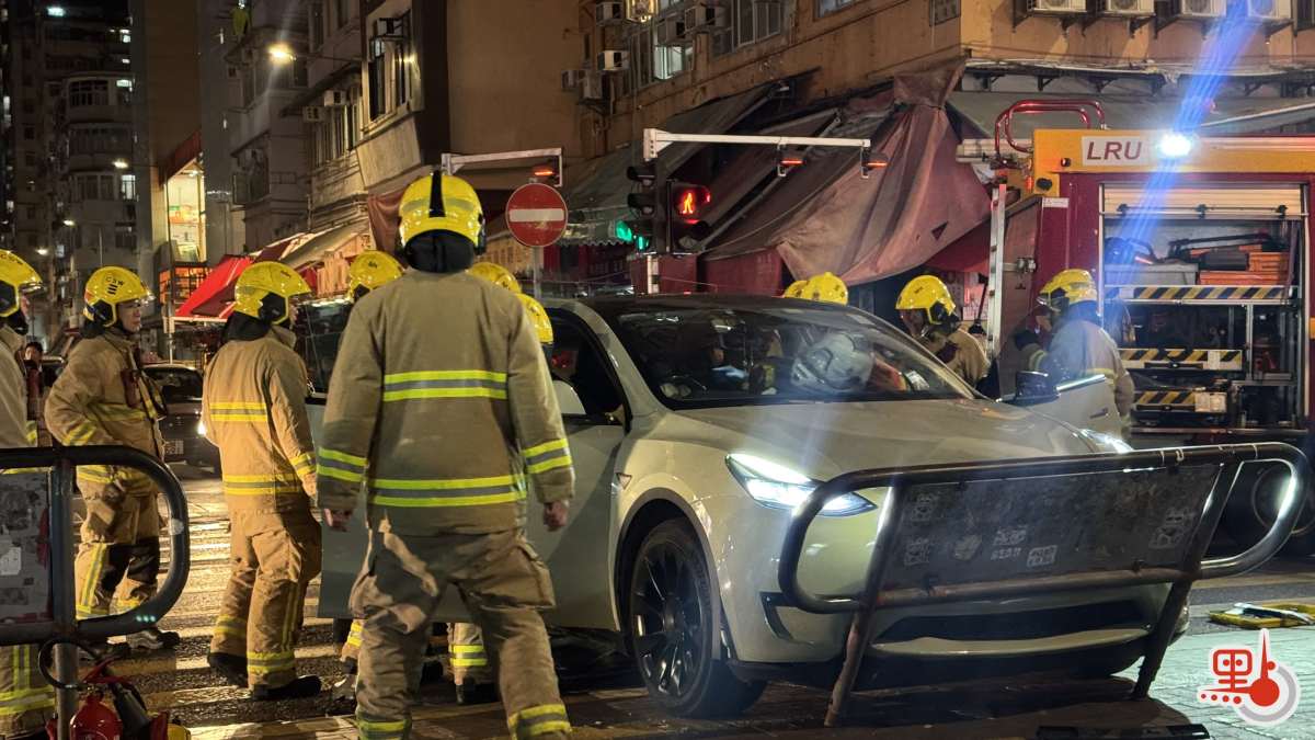 現場所見,失事的Tesla電動私家車撞向路中分隔馬路及行人專用區的鐵欄。消防員則用應急插頭及車輪膠頂固定車身,以免電動車再次失控。事件仍在調查中。