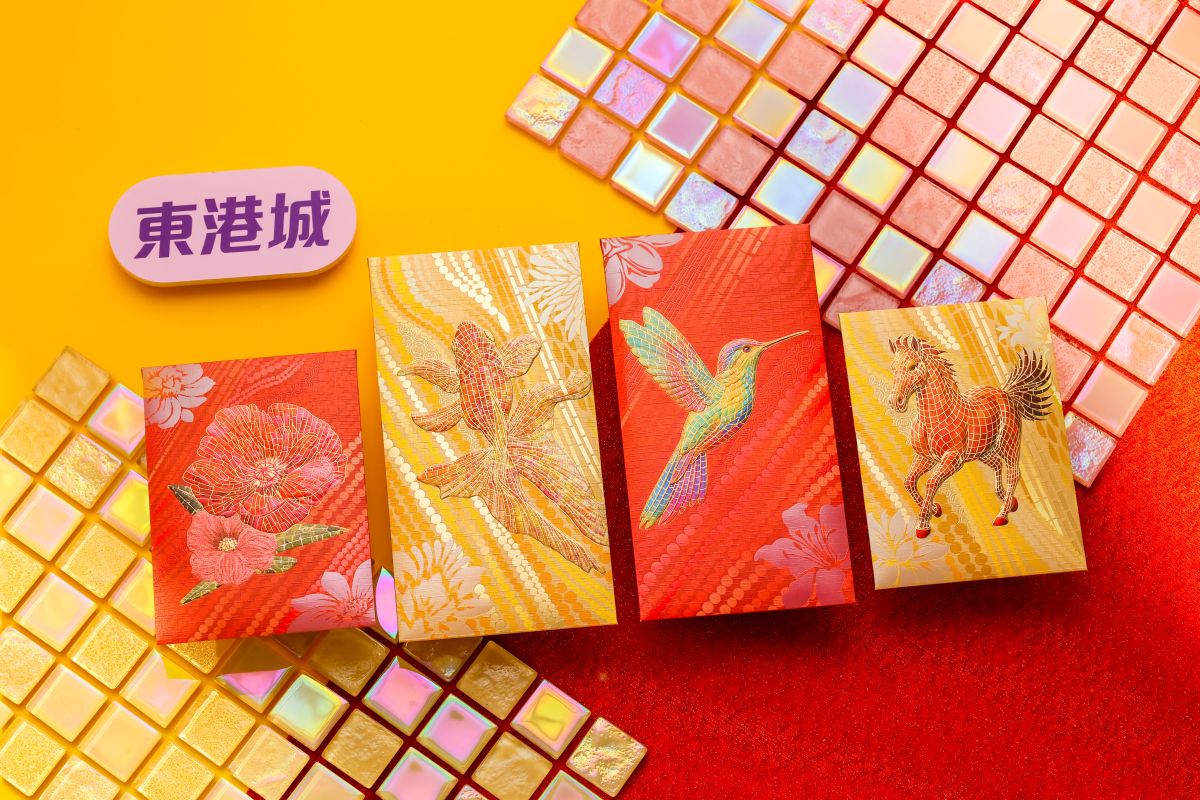 將軍澳東港城推出「千格玲瓏」限量版精緻利是封,以古典馬賽克鑲嵌藝術為靈感,透過千格色塊拼貼呈現4款祥瑞圖案(錦鯉、蜂鳥、駿馬、牡丹)。每套內附8個利是封(4款各2個),包裝以啞色燙金漸變及「金馬迎春」幻彩印章設計。