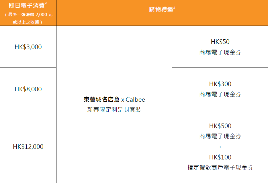 換領方法:於場內指定商戶即日以電子貨幣消費滿指定金額,即可換領東薈城名店倉×Calbee新春限定利是套裝(一套10個,五大Calbee角色設計,寓意不同祝福,附Jagabee Potta毛絨索袋)及高達950元無消費門檻商場及指定餐飲電子現金券。
