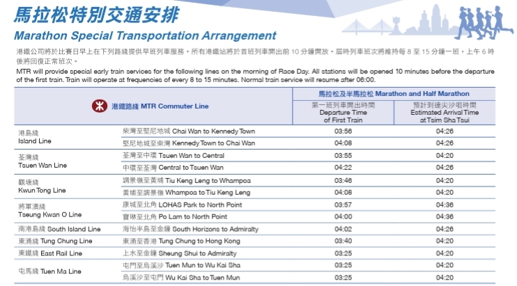 封路期間,共有220條日間巴士線、34條日間專線小巴、49條通宵巴士及6條通宵小巴路線需分階段暫停、縮短或改道,天后、中環、尖沙咀等多個巴士總站將暫停使用。為疏導人潮,港鐵8條鐵路綫的頭班車將於本周日提早開出,最早於凌晨3時25分行駛。此外,大會將設立28條特別巴士路線服務參賽者及市民。