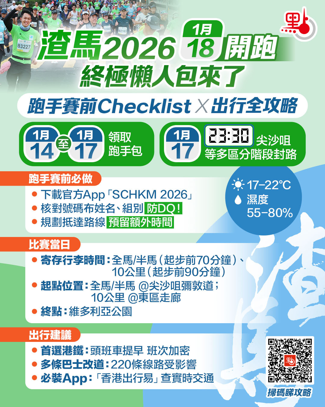 參賽者可於明日(14日)至本周六(17日),按預約時段前往啟德體育園體藝館領取跑手包,領取前必須下載大會官方應用程式「SCHKM2026 Official App」(點擊下載)進行預約。同場將舉辦馬拉松博覽會,提供活動及商品售賣。大會提醒,需寄存行李的全馬及半馬跑手,須於比賽開始前70分鐘到達行李檢查站;十公里跑手則需提前90分鐘。