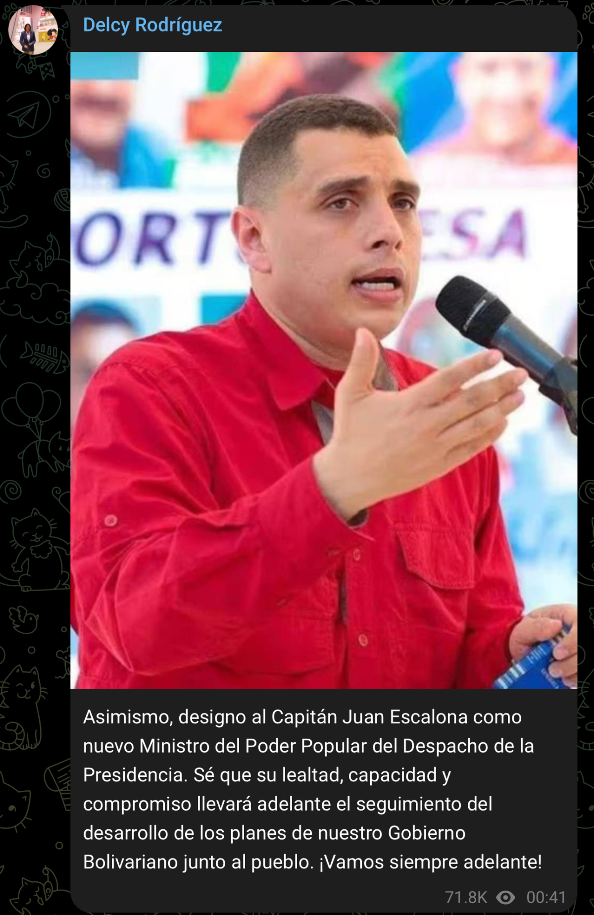 埃斯卡洛納曾擔任馬杜羅的前任烏戈·查韋斯的助理,後加入馬杜羅的安保團隊。1月3日,馬杜羅與妻子在美軍對加拉加斯的空襲中被強行控制,並被擄至美國。埃斯卡洛納上周現身羅德里格斯召開的首次內閣會議,從而粉碎了他已在空襲中身亡的傳言。羅德里格斯通過「電報」平台宣布了上述人事任命,並稱讚埃斯卡洛納忠誠可靠、經驗豐富。