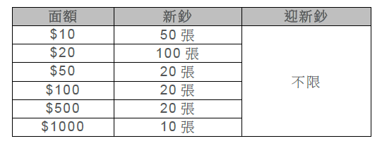 ◆ 每間分行的新鈔數量將因應該區需求而訂定,每天額滿即止;但銀行會確保分行每天均有新鈔及「迎新鈔」供應,並安排職員為市民提供協助。