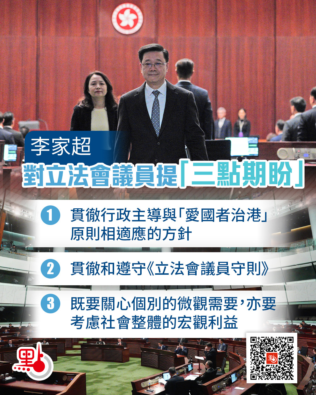 李家超指「三點期盼」是:第一,貫徹行政主導與「愛國者治港」原則相適應的方針,堅持和完善行政主導,確保行政立法良性互動,既互相制衡,又互相配合;第二,議員貫徹和遵守《立法會議員守則》,以國家根本利益和社會整體利益行事,不追求個人政治利益與榮耀;第三,議員既要關心個別的微觀需要,亦要考慮社會整體的宏觀利益,分析問題時,把握好五個系統關係,即全局和局部、當前和長遠、宏觀和微觀、主要矛盾和次要矛盾、特殊和一般的五個關係。