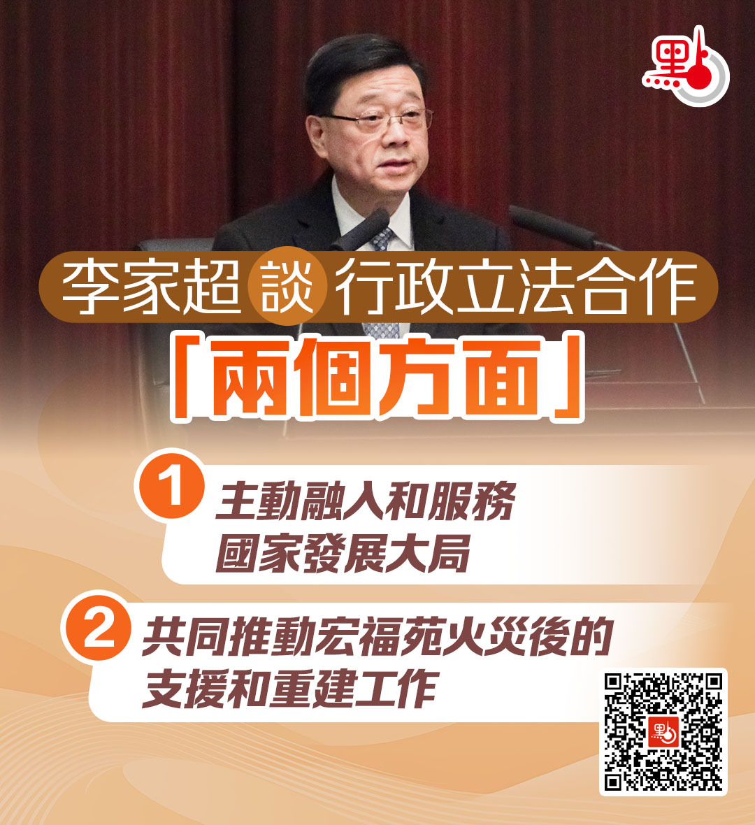 李家超亦提及,接下來行政立法合作的主要「兩個方面」:第一,主動融入和服務國家發展大局,包括主動對接「十五五」規劃、更好統籌發展和安全,加快發展北部都會區,鞏固和提升香港國際競爭力等;第二,共同推動宏福苑火災後的支援和重建工作,推行系統性改革,打破利益藩籬,不允許悲劇再發生。