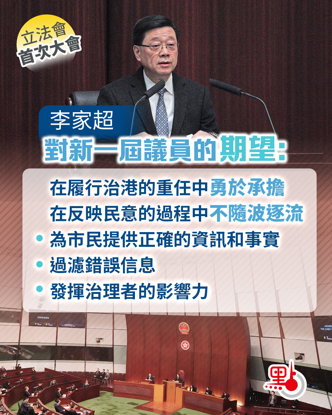 李家超強調,第八屆立法會任重道遠,政府和立法會要做的工作很多,處理火災後的支援和重建是即時的工作,同時要拚經濟、謀發展、搞建設、惠民生,包括:加快發展北部都會區;建設北都大學城,建設國際高等教育樞紐與國際高端人才集聚高地;推動高質量發展;建設香港產業發展;持續鞏固和提升香港國際競爭力;亦要不斷改善民生,包括土地房屋、交通運輸、醫療護理、社會福利、保障勞工、關愛共融等各民生範疇。