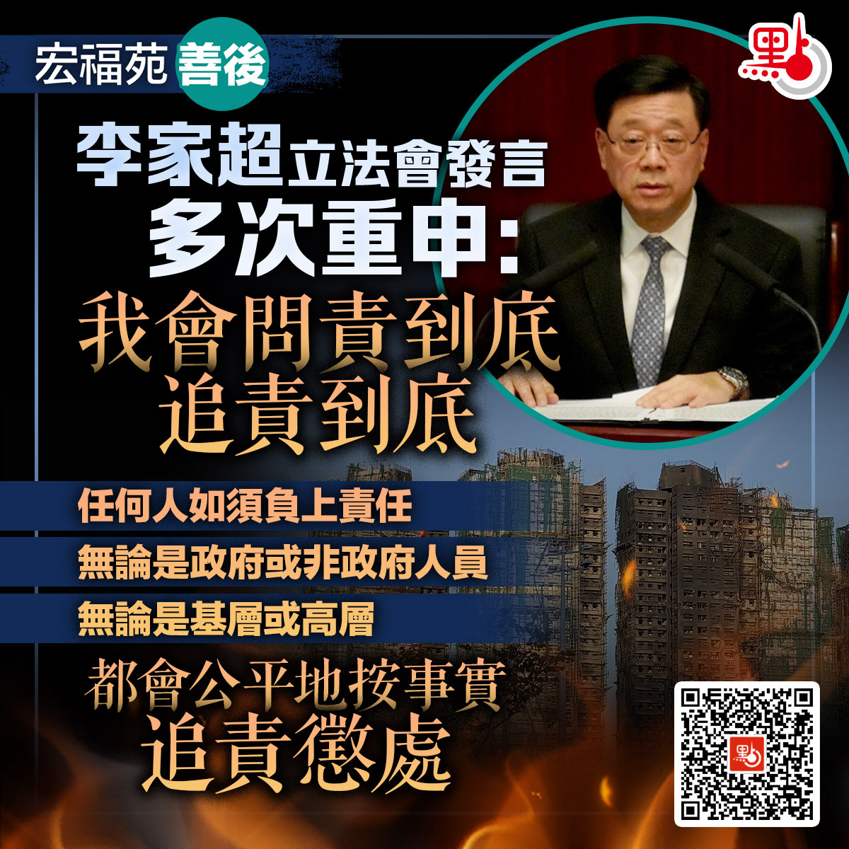 【點新聞報道】第八屆立法會今日(14日)上午11時在立法會綜合大樓會議廳舉行首次會議。在會議上,行政長官李家超發言時提及有關大埔宏福苑火災的支援和善後事宜。李家超在發言時重申,「我會問責到底,追責到底。我再次聲明,任何人如須負上責任,無論是政府或非政府人員;無論是基層或高層,都會公平地按事實追責懲處。」