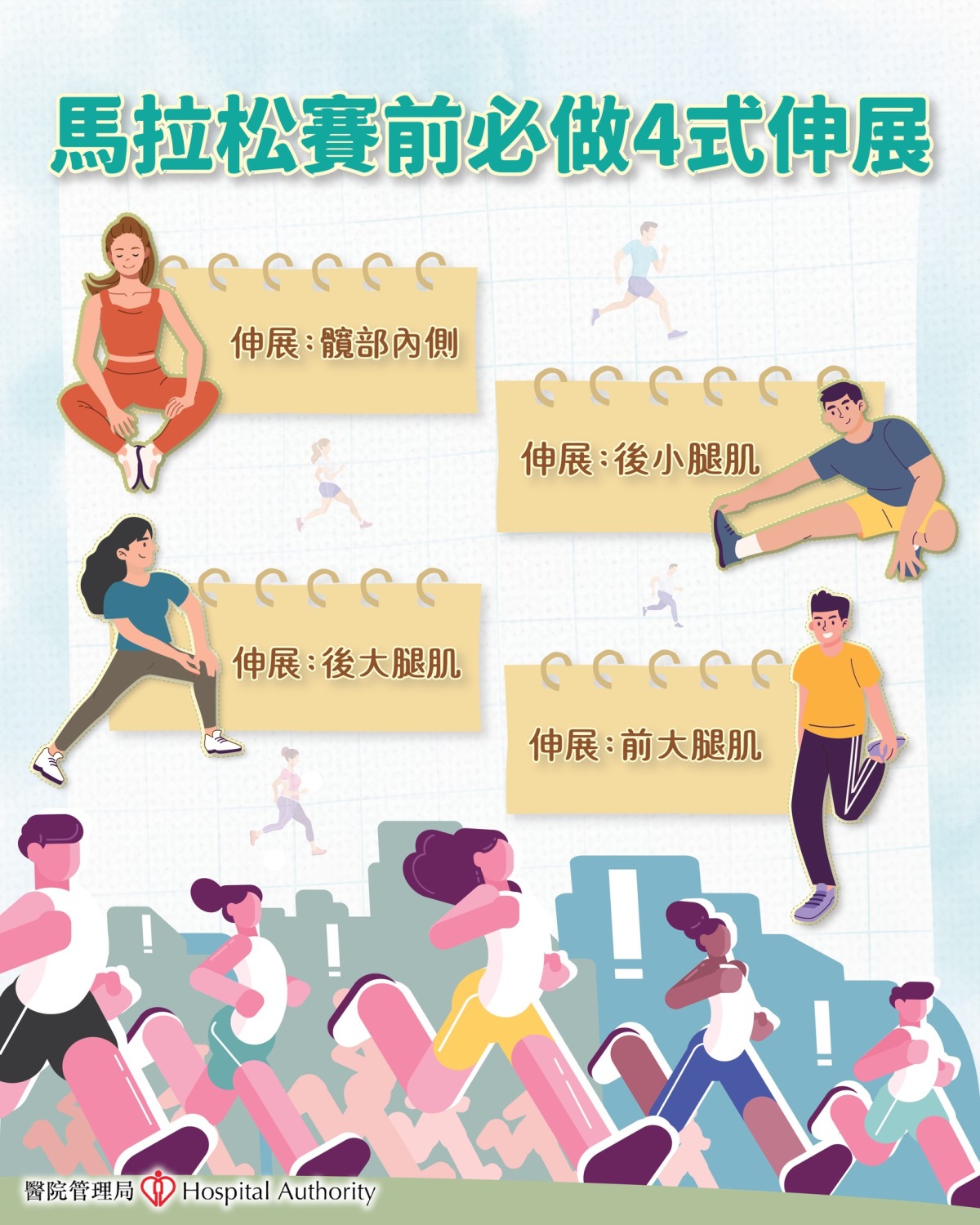 熱身分為4個步驟,包括髖部內側伸展、後小腿肌伸展、後大腿肌伸展以及前大腿肌伸展。醫管局指,跑步時人的腿部肌肉會過度收緊,因此參與賽跑運動有機會出現腿部抽筋,比賽前進行合適的伸展運動,既可增加肌肉及關節的靈活度,亦可避免受傷。