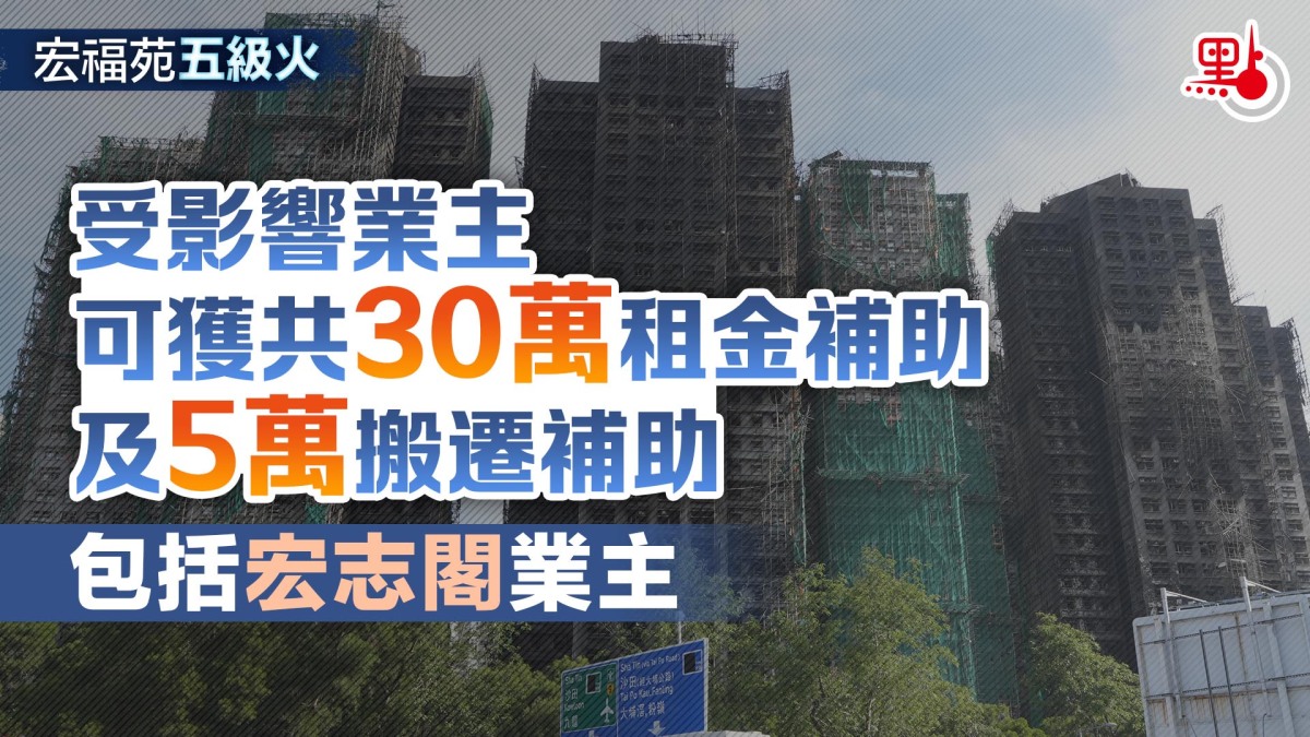 在住宿援助方面,政府上月宣布兩項支援受影響居民的新措施,包括向宏福苑業主發放為期兩年、每年15萬元的租金補助,每半年發放一次;以及向業主及租戶分別提供一次性5萬元搬遷補助,相關資助以每個單位為基礎,將透過「一戶一社工」發放。