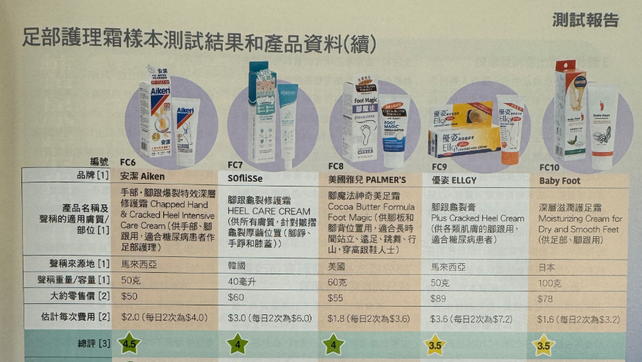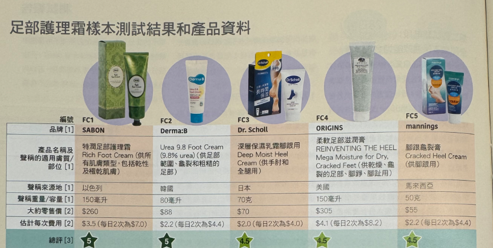 得分最高的足部護理霜是SABON特潤足部護理霜(Rich Foot Cream),容量為150毫升,售價260港元,商家指該產品適合所有肌膚類型,包括乾性和極乾肌膚,消費者委員會評估指,若每日使用該產品兩次,估計每次使用的費用為3.5港元,價格在測試的10款產品中屬中高端位置。