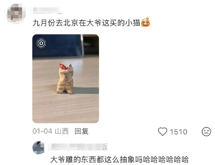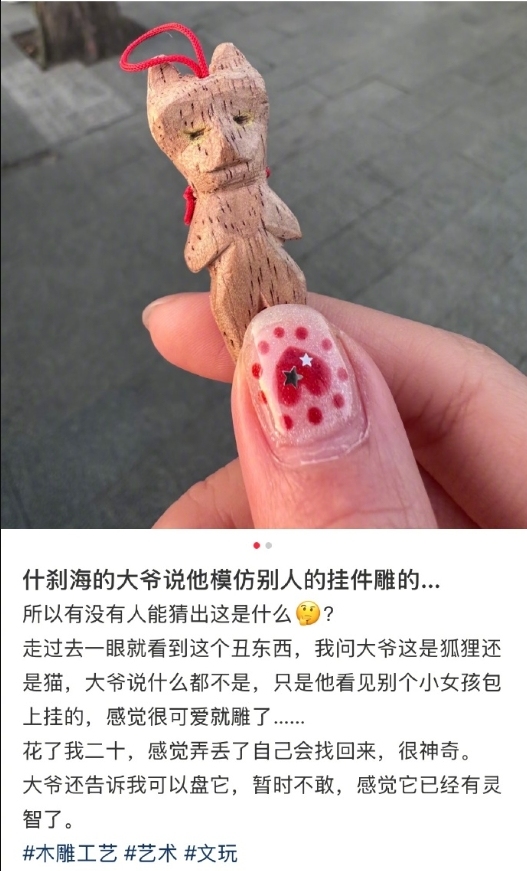 【點新聞報道】近日,北京什剎海一位賣手工木雕的老人爆火網絡,許多網友調侃木雕做得不像、抽象,甚至有點兒「醜」,也有人調侃「深耕二十年,還是門外漢」。老人說,自己也知道不像,「人們說抽象,抽象就是不像」。但就是因為抽象,讓許多年輕人喜歡老人的木雕。購買木雕的年輕人說,「看見這些可愛又抽象的小東西,感覺明天又有趣了一些。」