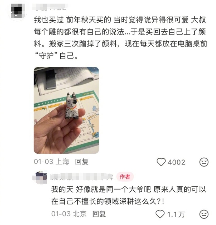 老人名叫胡茂應,今年65歲,從安徽到北京打工,十多年前開始擺攤賣自己雕刻的木雕。此前每天賣得很少,走紅之後,多年的存貨都賣光了。如今,老人每天晚上回去加班雕刻,第二天下午出攤,一邊雕刻一邊賣。
