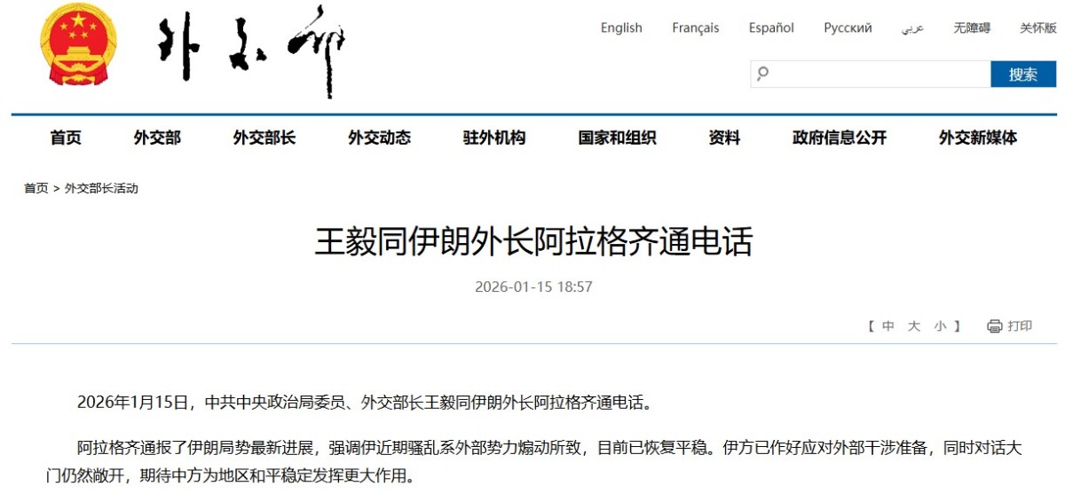 【點新聞報道】據外交部網站消息,1月15日,中共中央政治局委員、外交部長王毅同伊朗外長阿拉格齊通電話。