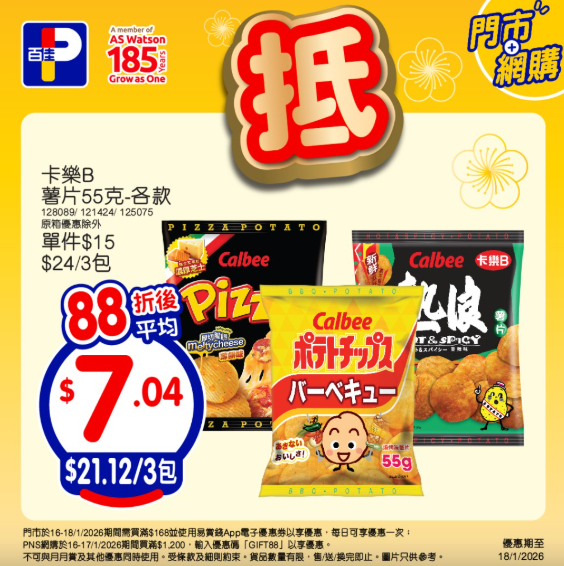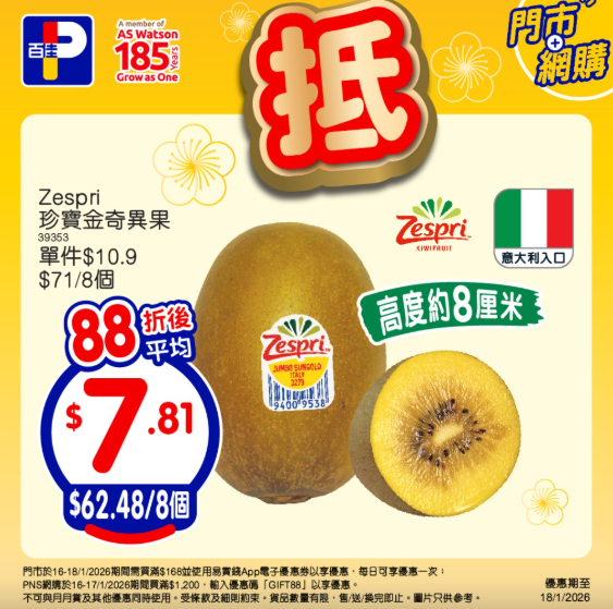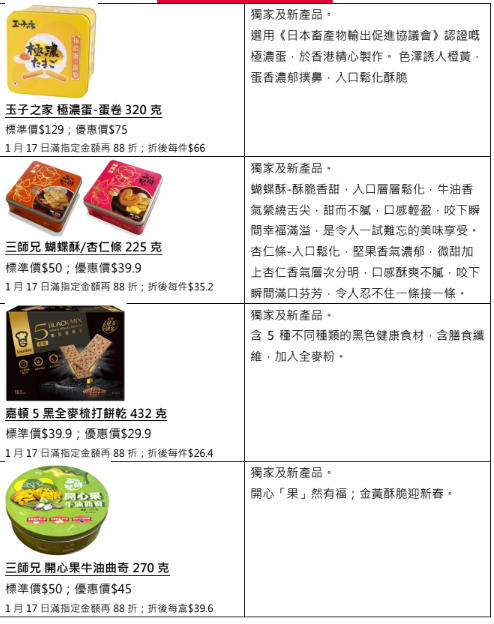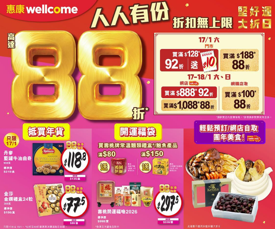 1月17日,於全線惠康門市買滿HK$128,即可享有92折優惠,更可獲得1張$10票尾現金券,於下次購物滿$138使用;買滿HK$188,更可享88折;於惠康網店買滿HK$888,即可享有92折優惠;滿HK$1088或滿HK$100並選擇「網購店取」,同樣可享88折優惠。全線紅/白餐酒買滿HK$300,即可額外享85折。