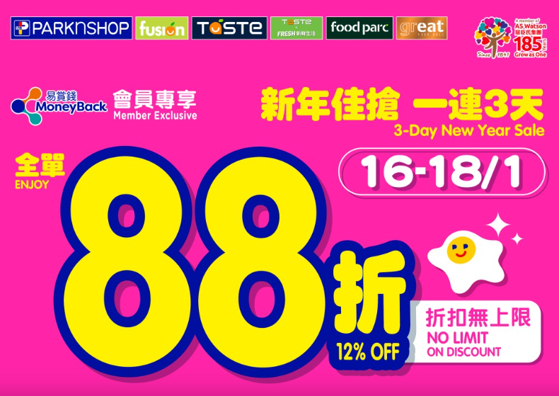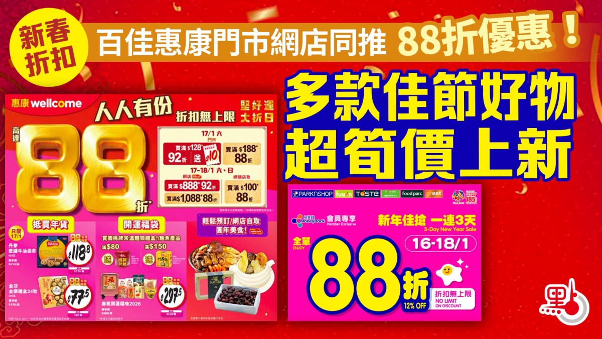 除惠康超市外,百佳超市亦推出「新年佳搶」推廣活動,由1月16日起一連三日,易賞錢會員在全線門市消費滿額即享全單88折,折扣更不設上限,是入手賀年禮品及食品的絕佳時機!