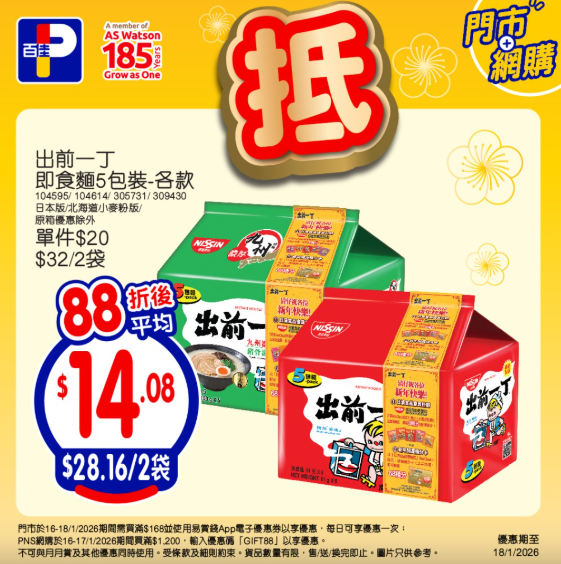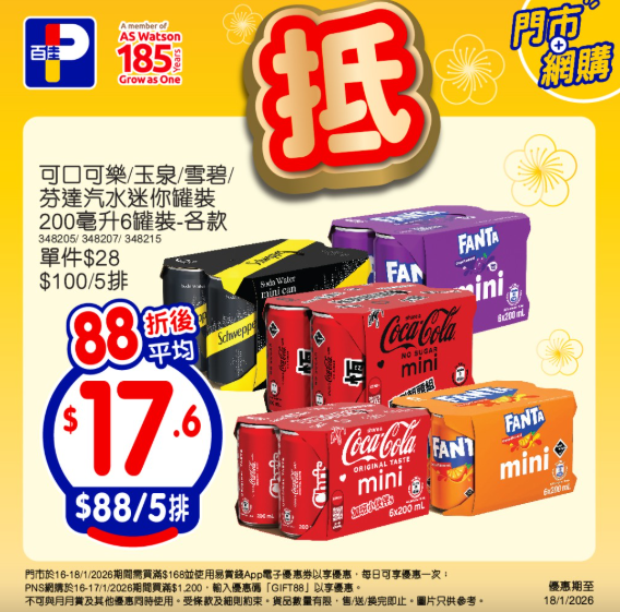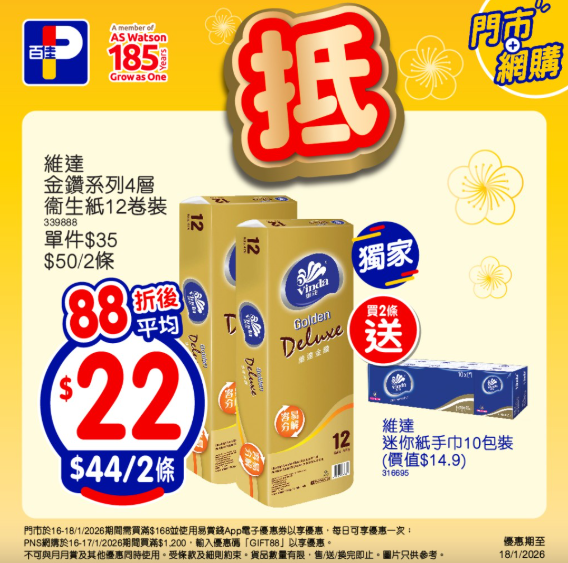 1月18日則為網店限定優惠,網店買滿HK$888,即可享有92折優惠;買滿HK$1088或買滿HK$100並選擇「網購店取」,同樣可享88折。