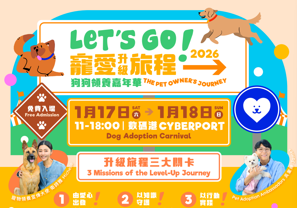 有關活動詳情,請瀏覽「Let's Go!寵愛升級旅程」狗狗領養嘉年華2026專題網站。