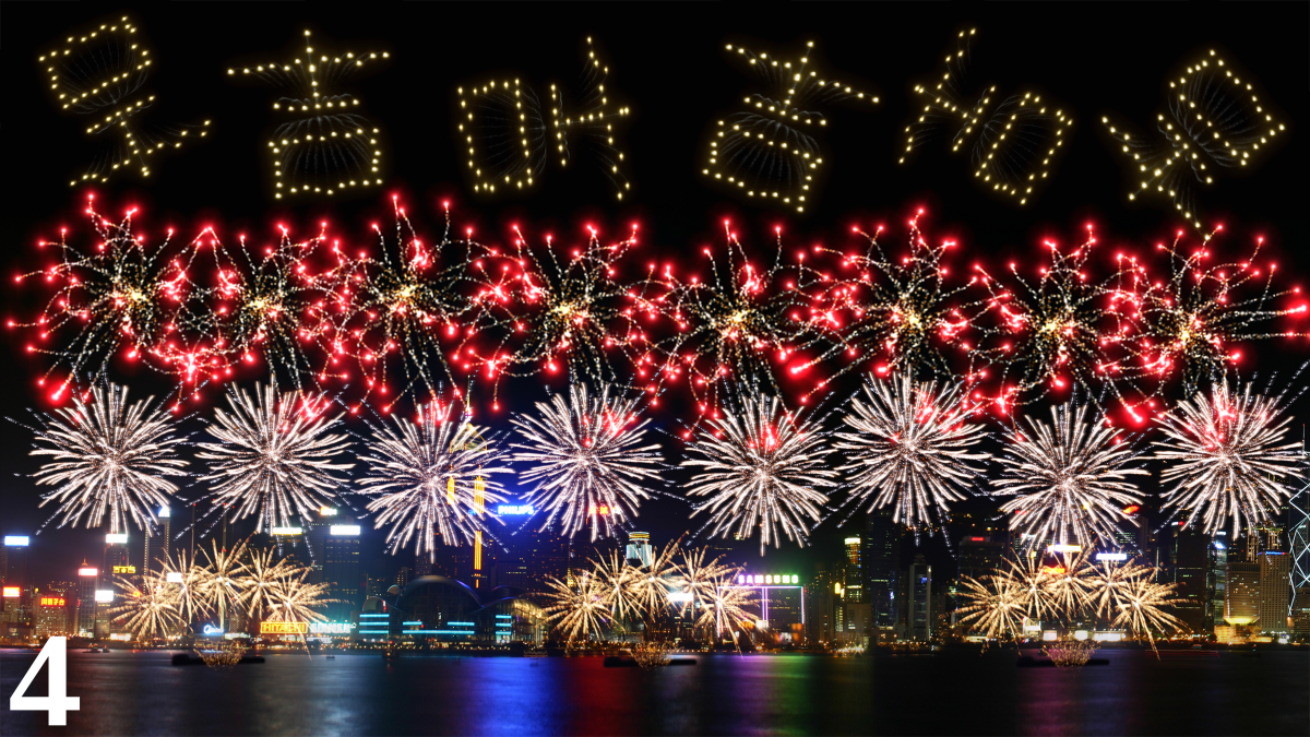 第三幕「躍馬騰飛」:以「馬蹄鐵」造型煙花作高空追逐效果,配合低空「WIN」字樣,祝願馬年旗開得勝。