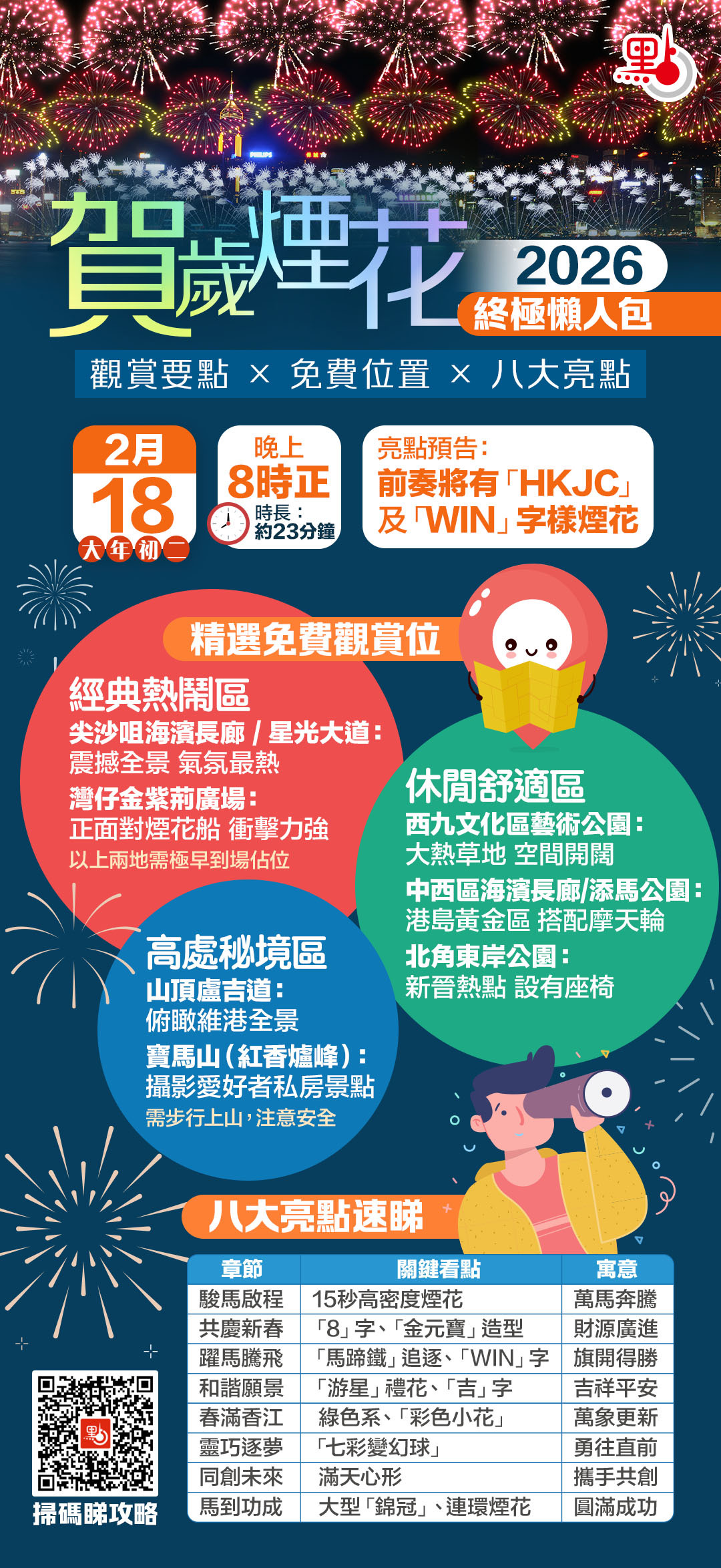 【點新聞報道】賀歲煙花匯演2月18日(農曆大年初二)再度亮相維多利亞港。這場由香港賽馬會獨家贊助的盛事,預計將吸引數十萬市民及旅客聚首維港兩岸,共賞花火照耀香江的動人美景。點新聞為你整合匯演詳情、8大亮點章節,以及11個視野絕佳的免費觀賞位置與交通指南,助你與親友共佔最佳位置,迎接這份震撼人心的新春賀禮!