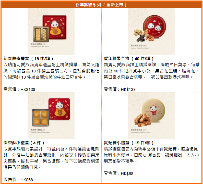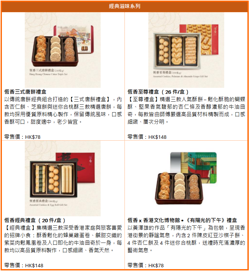 新歲伊始,恒香特意準備嶄新口味的恒香老餅家賀年禮盒及雞蛋卷系列均設經典傳統或特色新味,當中賀年禮盒囊括全新「新年熊貓系列」以萌爆可愛造型配合喜慶設計;雞蛋卷系列主打無添加防腐劑及人工色素,亦是全港碩果僅存的人工手轆雙層手造雞蛋卷。更有多款新品,包括蛋香濃郁的日本新紀元·曉雞蛋卷、茶香清雅的宇治抹茶雞蛋卷及南洋芳香的斑蘭雞蛋卷、經典必搶紫菜肉鬆鳳凰卷等。