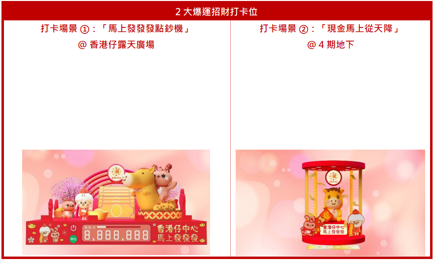 香港仔中心特設2大招財打卡位,「馬上發發發點鈔機」及「現金馬上從天降」寓意財運亨通,來年數錢數到手軟!