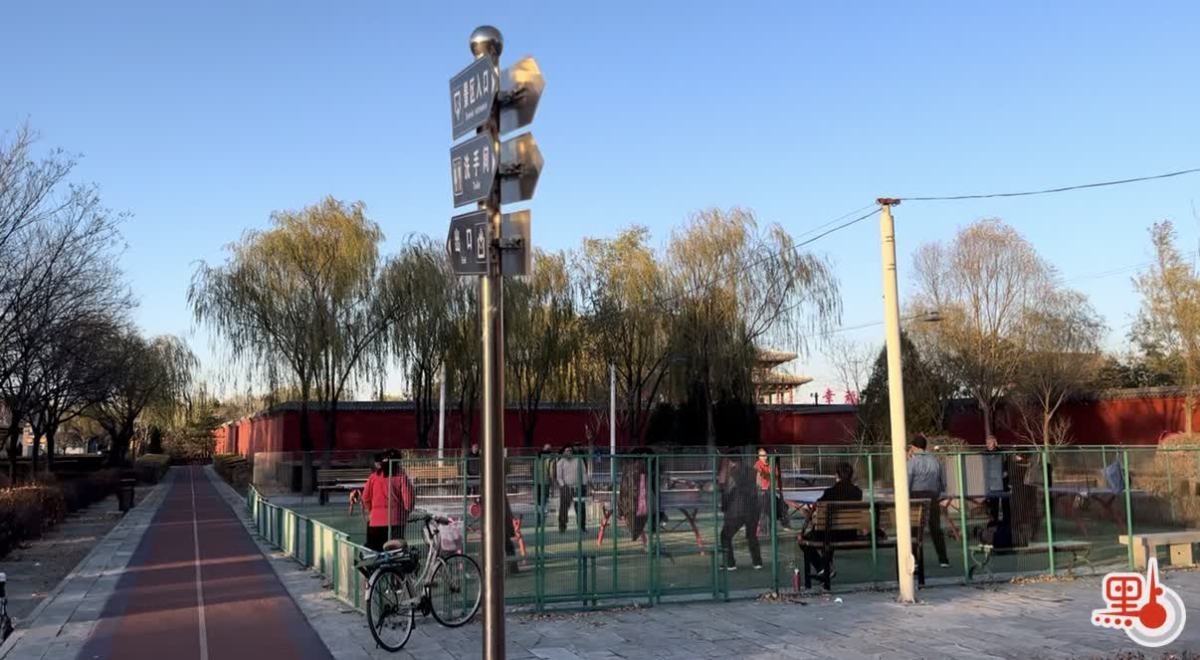 公園裏的日常生活依然按着自己的節奏進行。幾位老人穿着厚實的棉襖,在光影斑駁的林蔭間散步。幾張戶外乒乓球桌前居然圍滿了打球的鄰里,球拍擊中球面嗒嗒作響「啪嗒、啪嗒」,清脆而規律,在冷風裏聽來格外響亮。