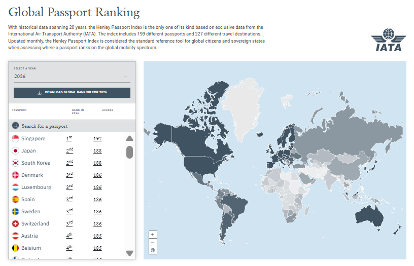 【點新聞報道】英國諮詢公司Henley&Partners近日公布2026亨利護照指數(Henley Passport Index),排名覆蓋199個國家及地區、227個旅行目的。結果顯示,新加坡蟬聯榜首、日本和韓國並列第二,丹麥、盧森堡、西班牙、瑞典和瑞士以186個免簽地並列第三。