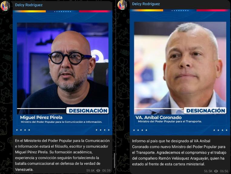羅德里格斯16日在社交媒體上發消息稱,已任命海軍少將阿尼瓦爾·科羅納多為交通部長、弗雷迪·尼亞涅斯為生態部長、米格爾·佩雷斯·皮雷拉為新聞和通信部長。