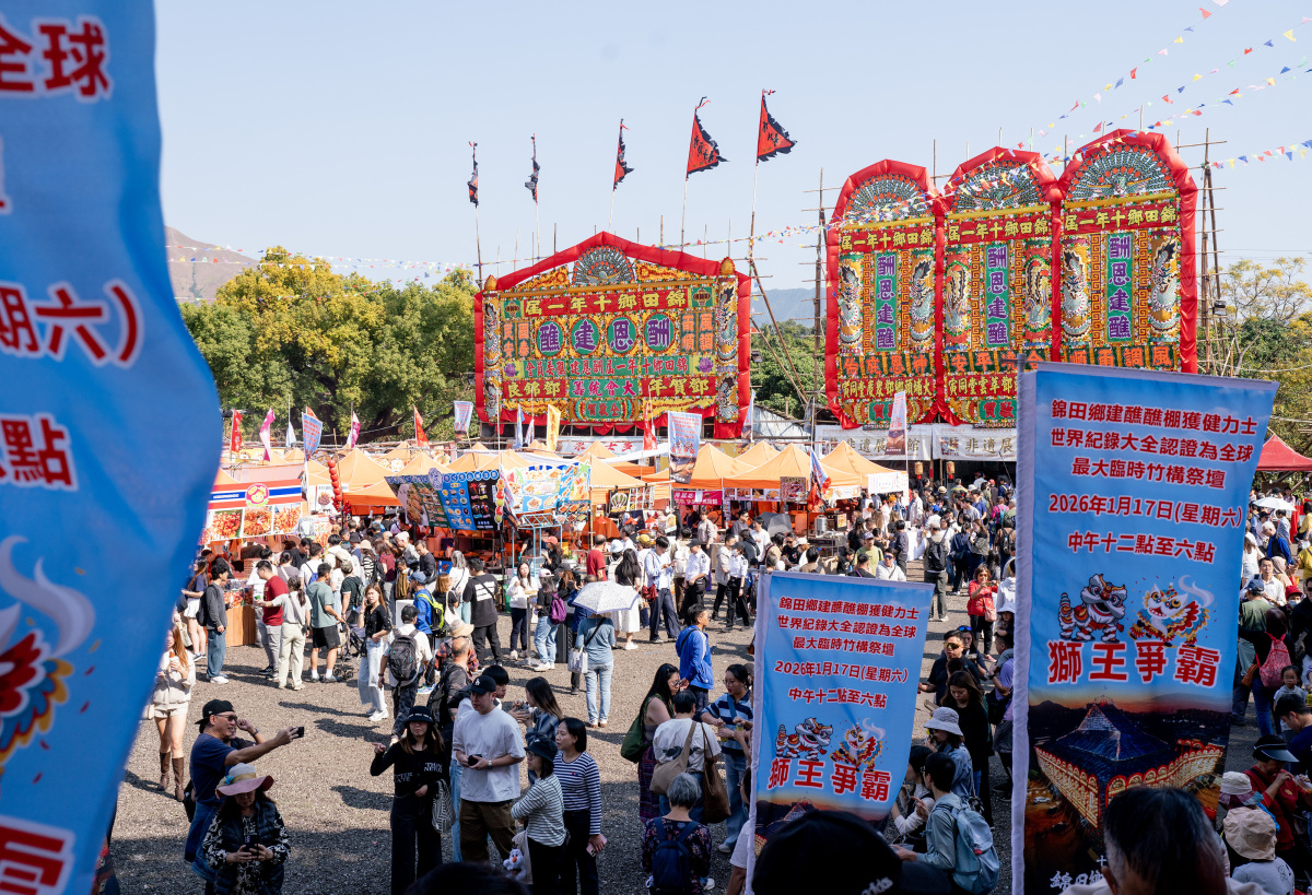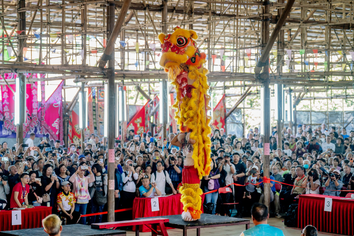 獅王爭霸賽今午在錦田鄉酬恩建醮大戲棚上演,共有28隊來自粵港澳三地的頂尖龍獅隊齊聚現場,以高樁採青、靈活套路競逐「錦田獅王」殊榮。