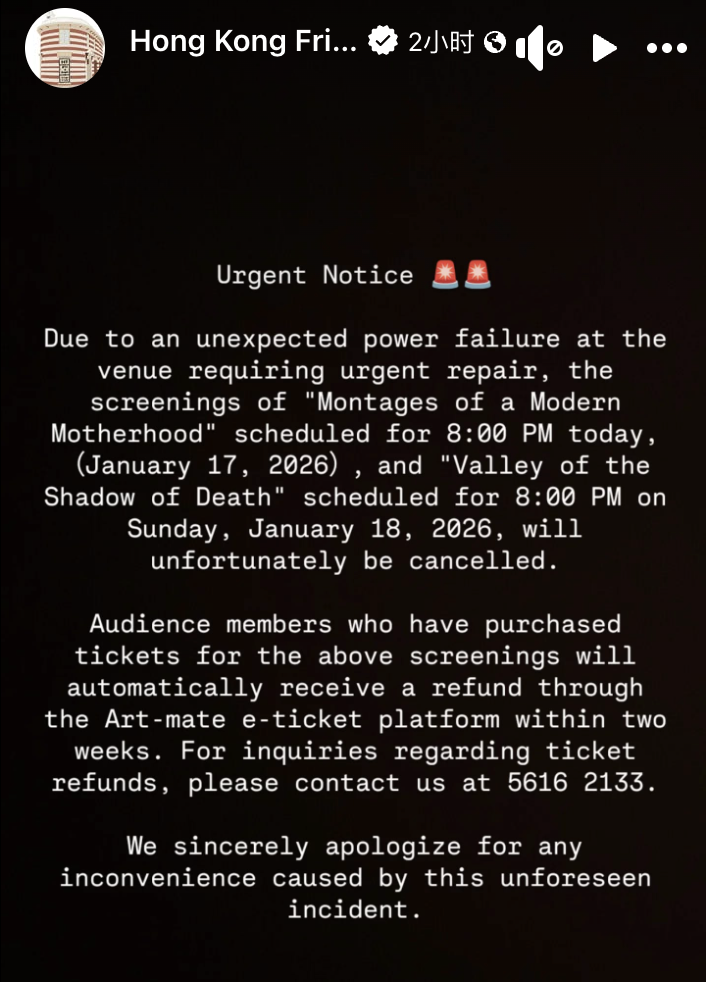【點新聞報道】藝穗會原定今晚(17日)及明晚(18日),在中環會址分別放映港產電影《虎毒不》及《不赦之罪》,但會方下午在社交平台公布,因場地出現電力故障需立即維修,兩場放映將被取消。